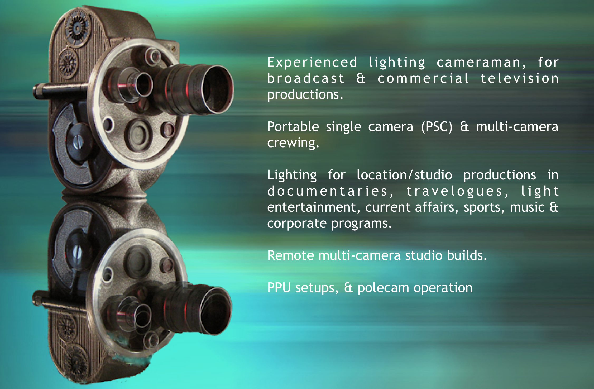 Whether it's a single camera PSC shoot, a multi-camera show or a studio programme I enjoy working and collaborating on them all and hopefully with a little bit of good humour.